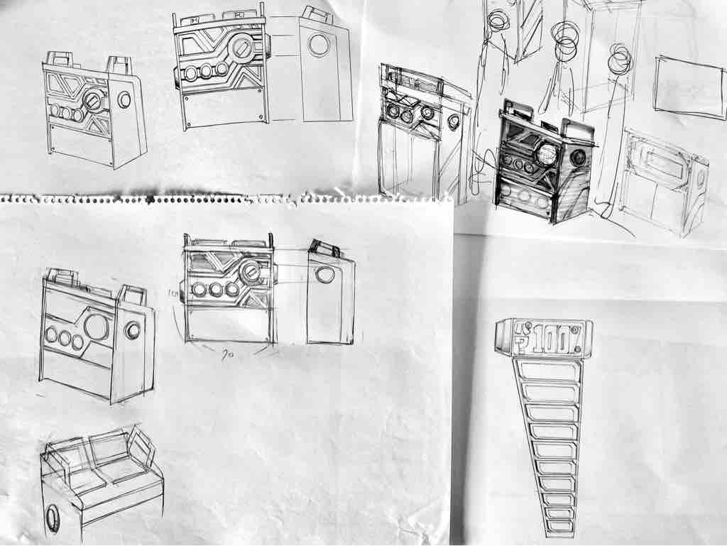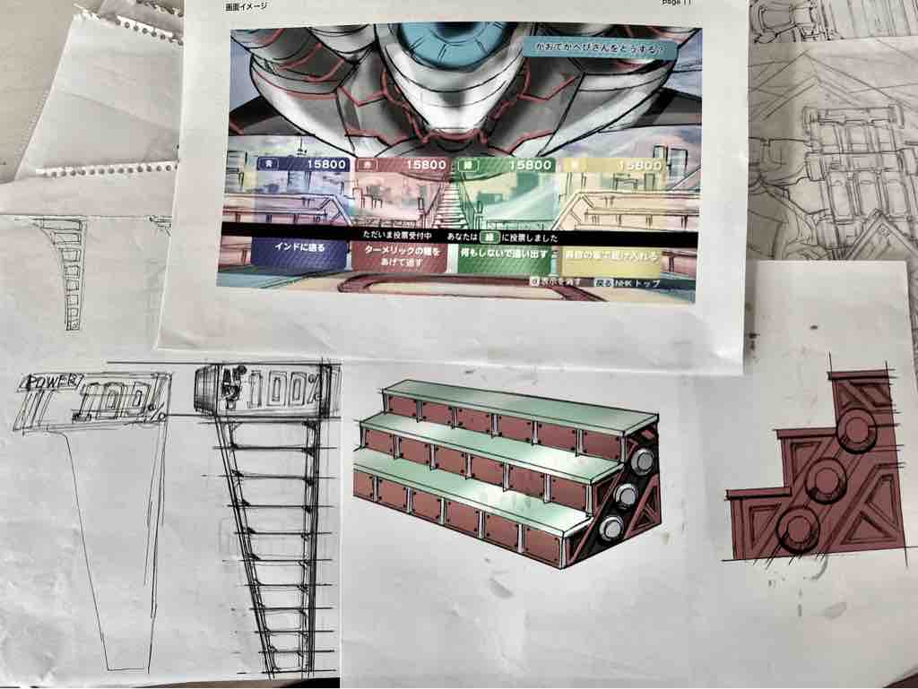 2023年10月18日 【エリアB】生放送用のコンソール / [Area B] Console for live broadcasting. コメント数:0 コメント カテゴリ:メカニックデザインエリアB by UGAT セットの雰囲気に合わせた手元のパソコンを隠す台。作りやすいようパネル構造にして、デザインパーツも観覧席と共通にして作業しやすいよう考えてはみてる。